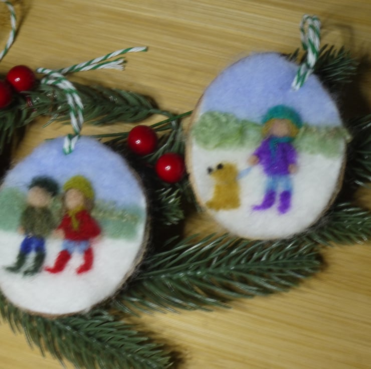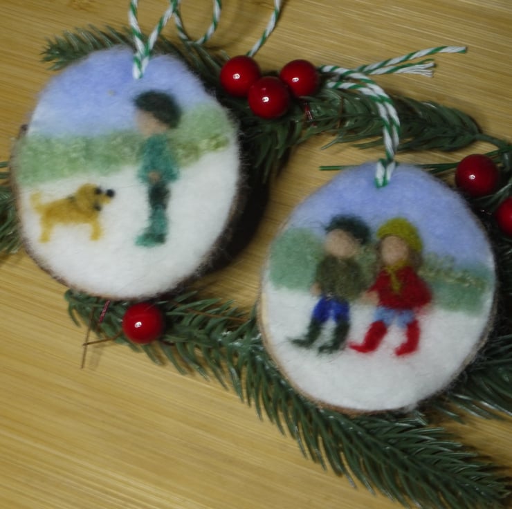 Set of 3 log slice needle felted ornaments featuring a christmas couple and dog. Each log slice varies slightly in shape and size but make lovely ornaments for the tree or to be used as gift toppers so you can gift someone a special ornament to use for years to come. Each has green twine for hanging on your tree or gift. These ornaments are a one off design, like all our felted items non can be replicated exactly due to the fibres used.