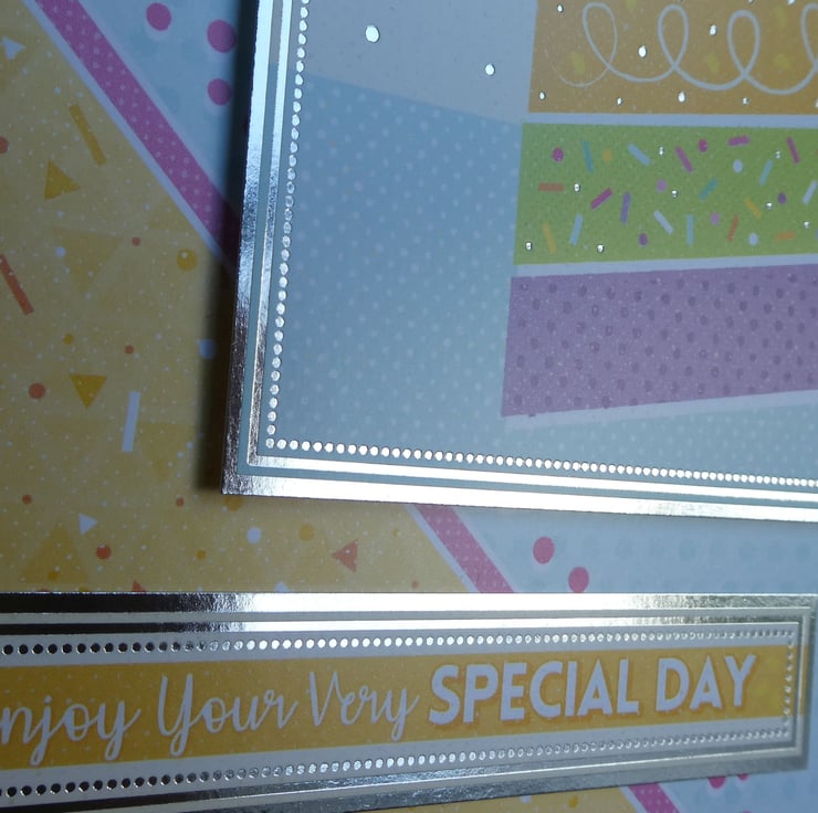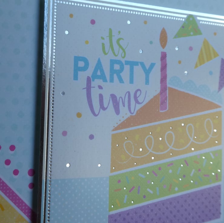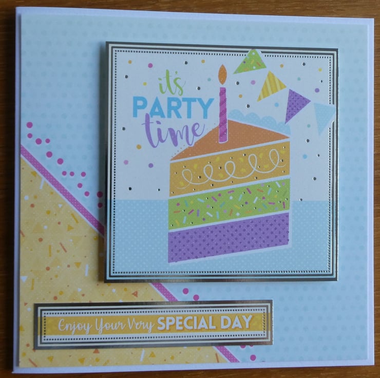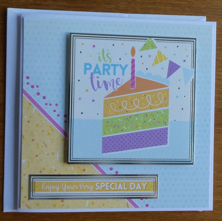 A square card topper has been added, offset to the top right, with a printed image of a slice of birthday cake with a candle and bunting and the message It's Party Time. The topper has been mounted on foam pads to add dimension.