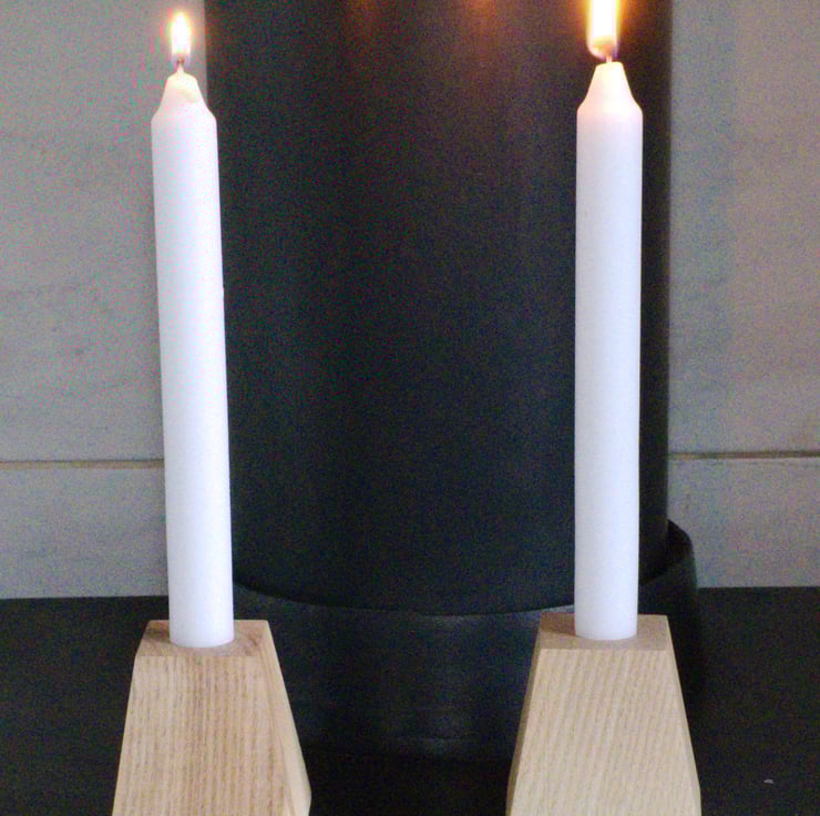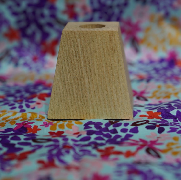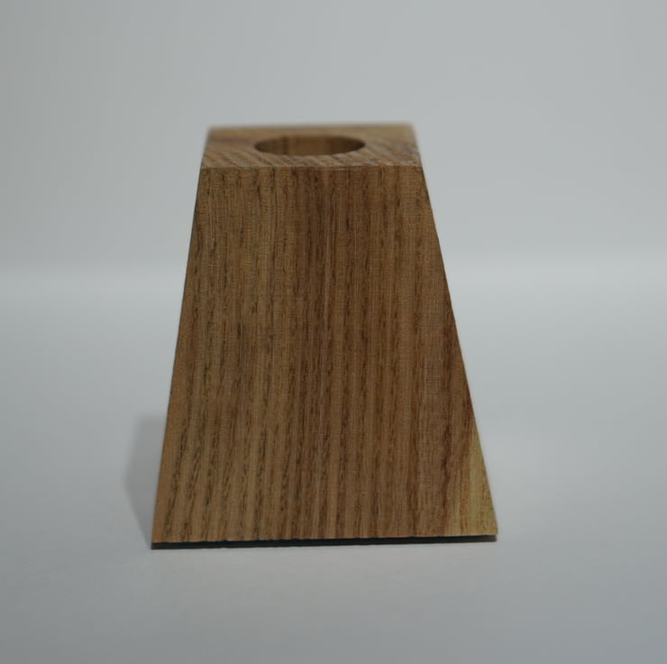 A square tapered ash wood candle holder, 6cm x 6cm base tapering to 3.5cm top with 6cm tall. Finished with a clear lacquer with a felt base to prevent scratches on your surfaces.