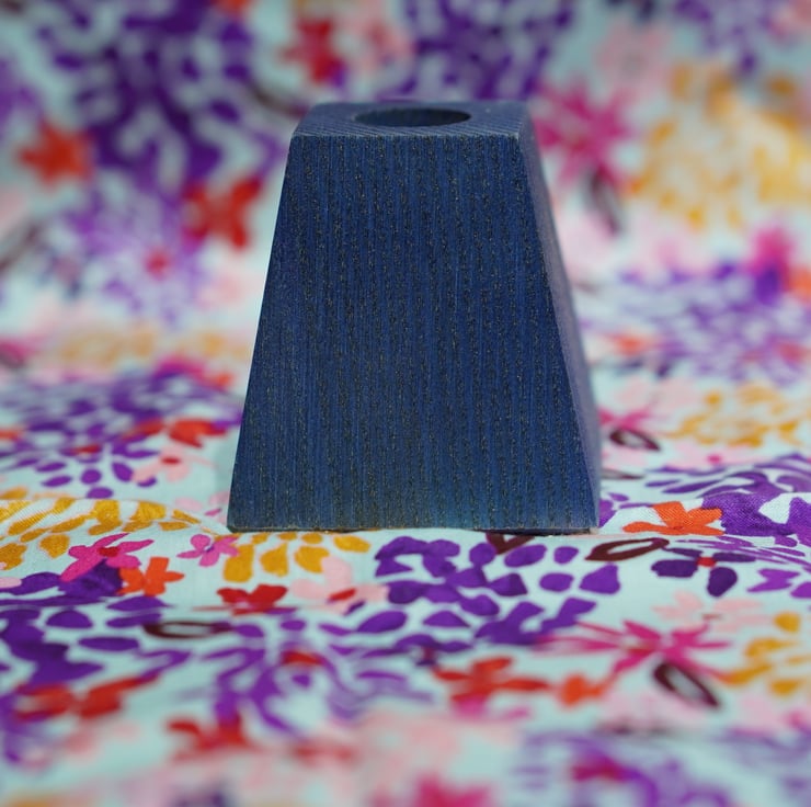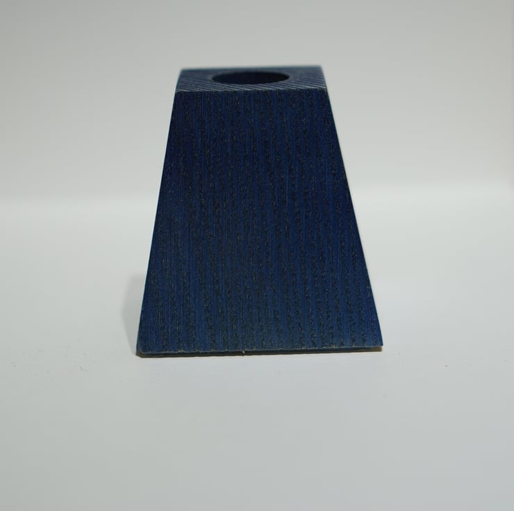 A square tapered ash wood candle holder, 6cm x 6cm base tapering to 3.5cm top with 6cm tall. Finished with a blue stain and a clear lacquer with a felt base to prevent scratches on your surfaces.