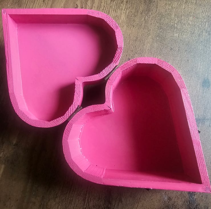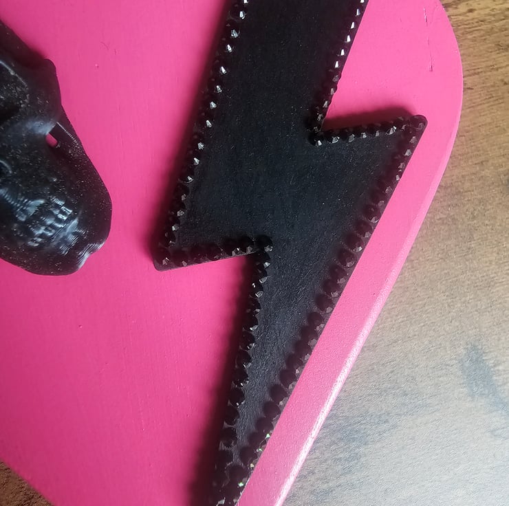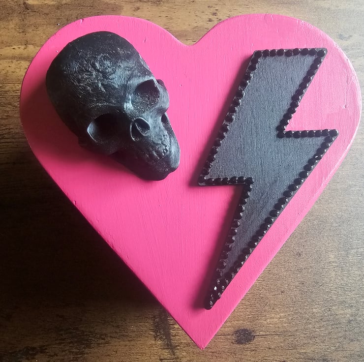 Bright pink heart shaped box with black skull, lightning bolt and star embellishment.