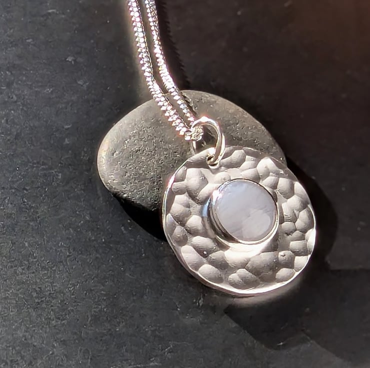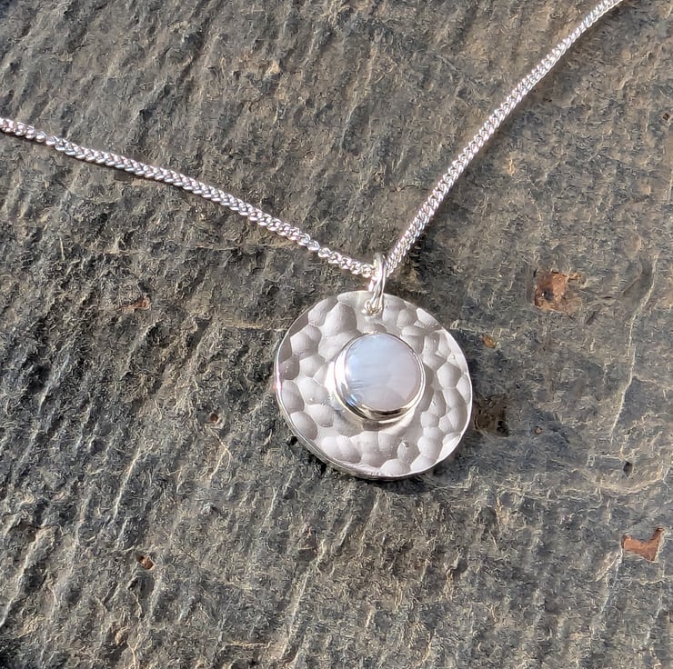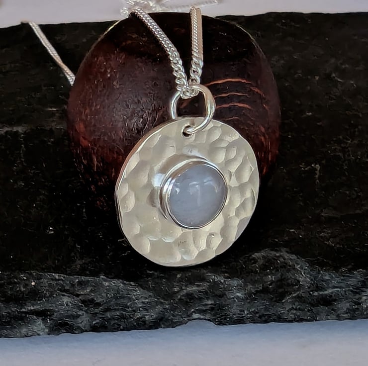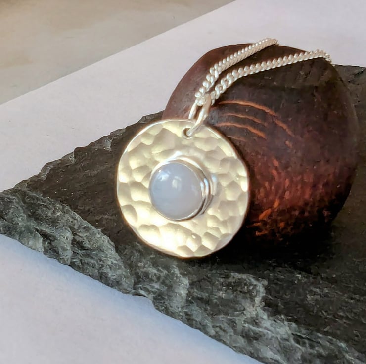 Softly beaten textured 25 mm disc set with a beautiful subtle Blue agate 8 mm cab genstone.
