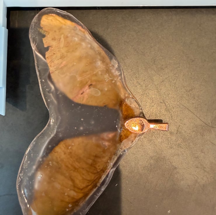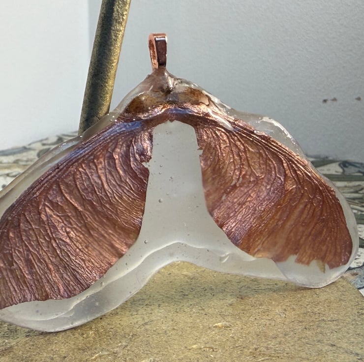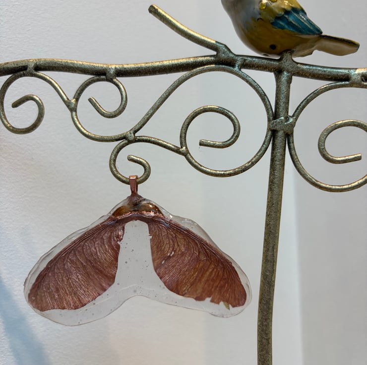 A pretty locally collected sycamore double seed, painted with metallic rose pink then preserved in resin and finished with a stainless steel clasp