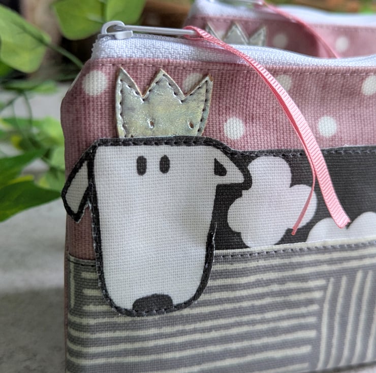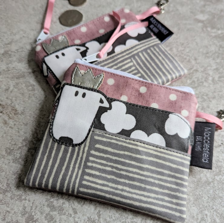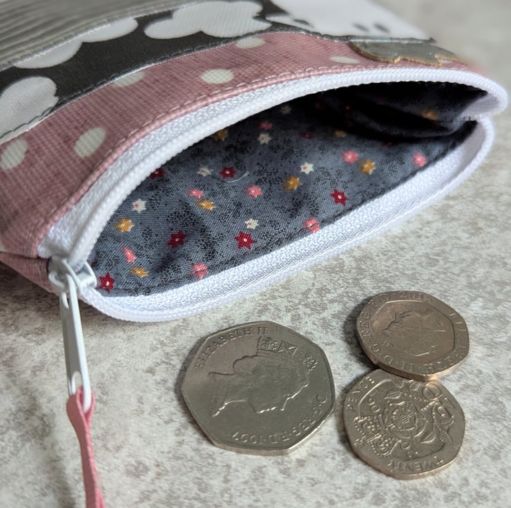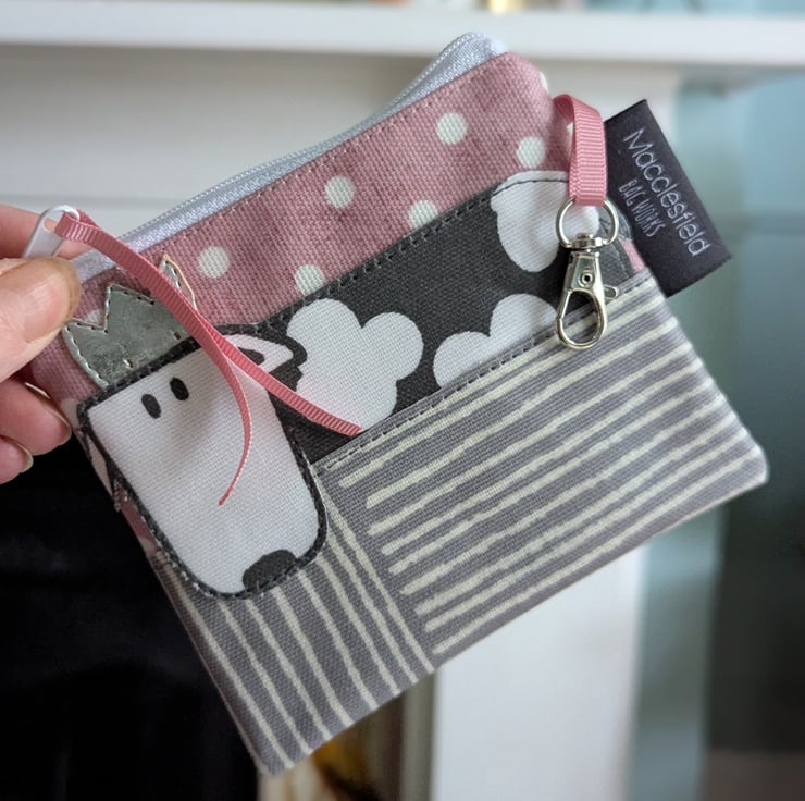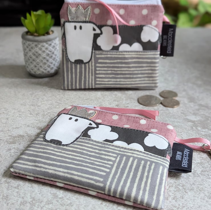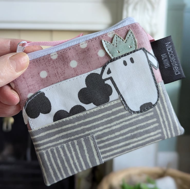 Cute quirky and unique coin and card purse hand-made using PVC coated cotton (oilcloth). Each 'cow looking over the wall' has a silver coloured cork fabric crown and has been individually created by cutting out and layering and stitching pieces of oilcloth fabric onto a polka dot dusky pink oilcloth background.