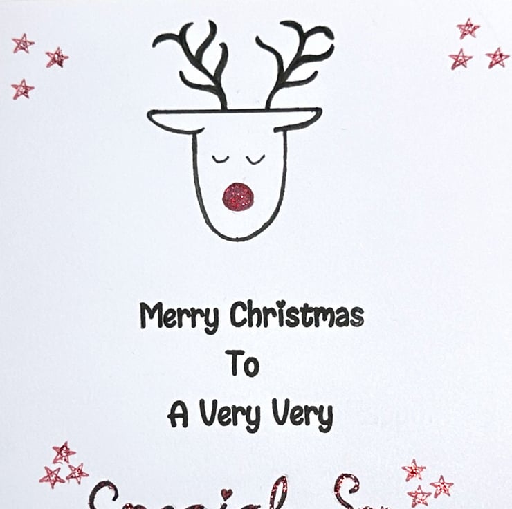 Hand drawn it features Rudolph with his shiny red nose, stars and glitter overlay across the message.