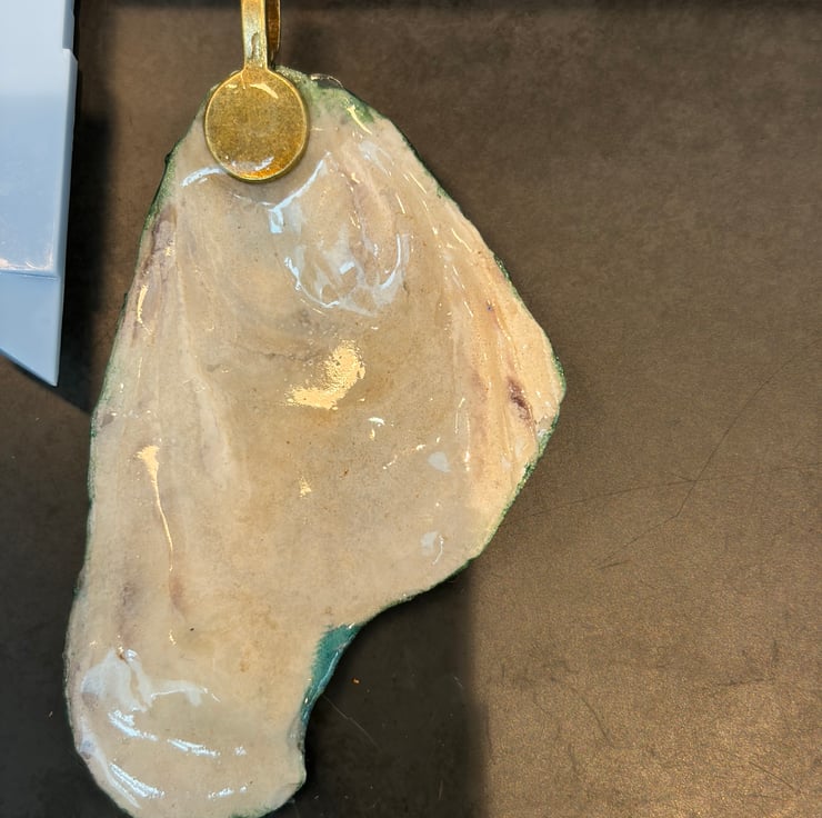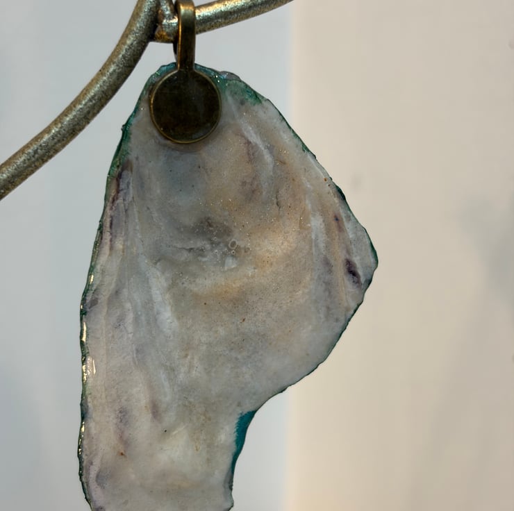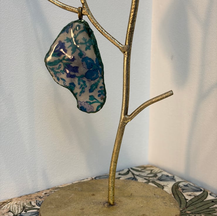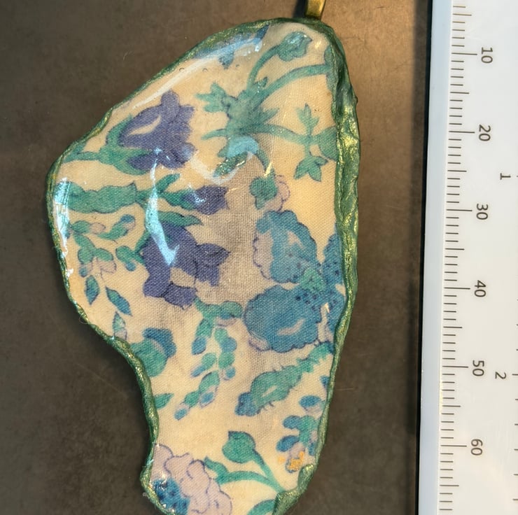 Pretty floral liberty of london material decoupaged onto a piece of partial locally collected clam shell finished with resin and a stainless steel clasp