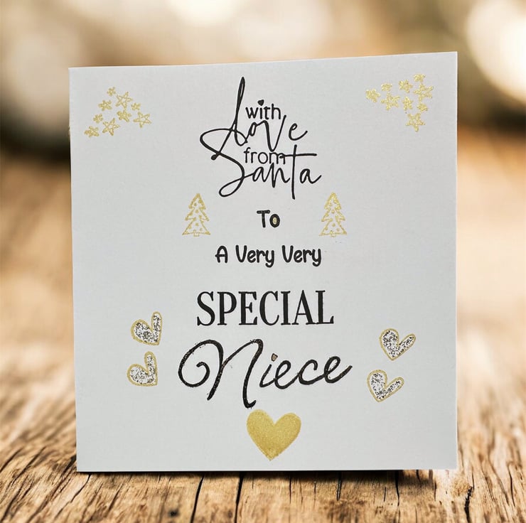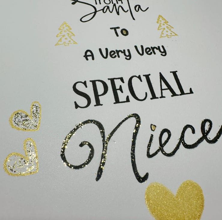 It features a message “with love from Santa” and tells her how very special she is to you. Surrounded by golden hearts and mini Christmas trees in a shimmery ink with a glitter overlay sitting lightly over the word Niece.