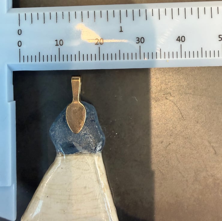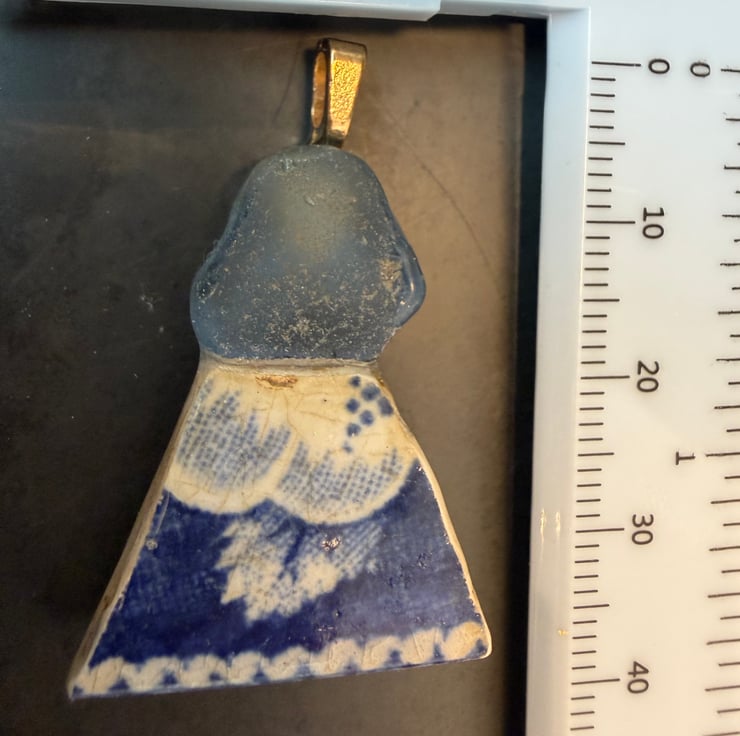 Locally found sea pottery and sea glass resined together finished with a stainless steel gold pendant