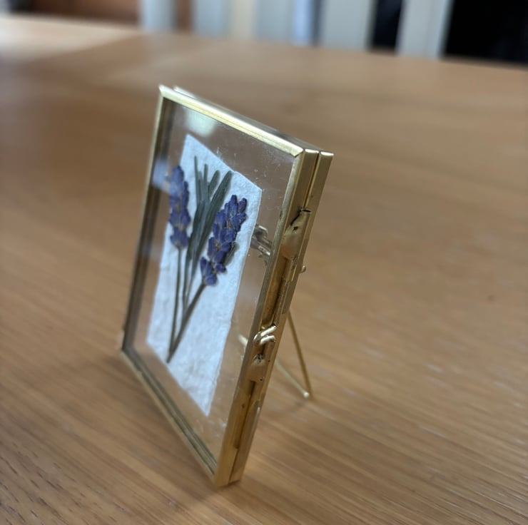 This is a one of a kind handcrafted art piece using pressed English lavender picked from my own garden, mounted on a vintage clear glass and metal frame