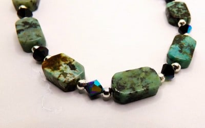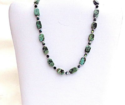 Beautiful handmade gemstone African turquoise jasper and crystal necklace . The necklace features African Jasper but due to it's beautiful turquoise colour and black veining it is known as African Turquoise.