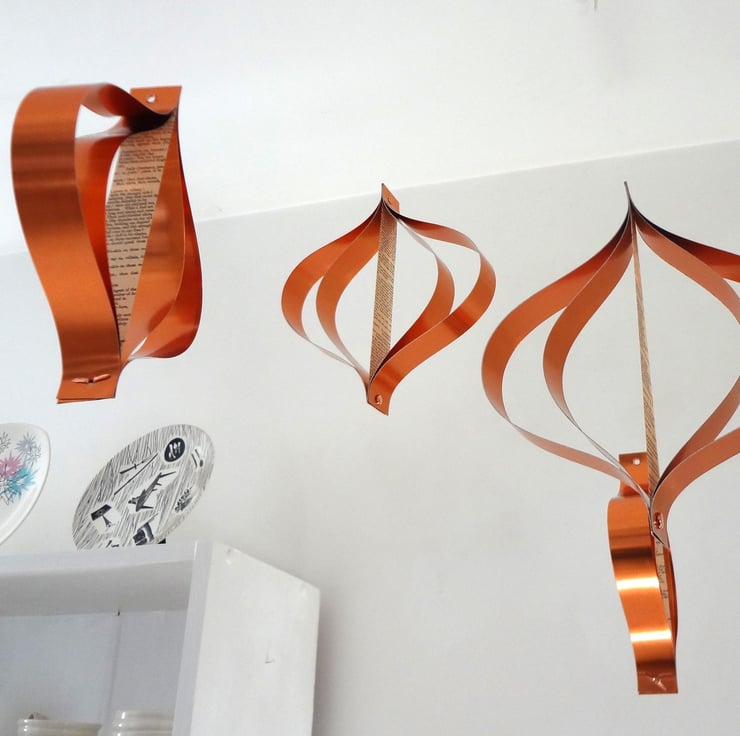 I fit them with metal eyelets and supply invisble thread for ease of hanging. Each ornament is approximately 15 x 20 x 4cm. They are made of high quality copper-filmed card and are very shiny!