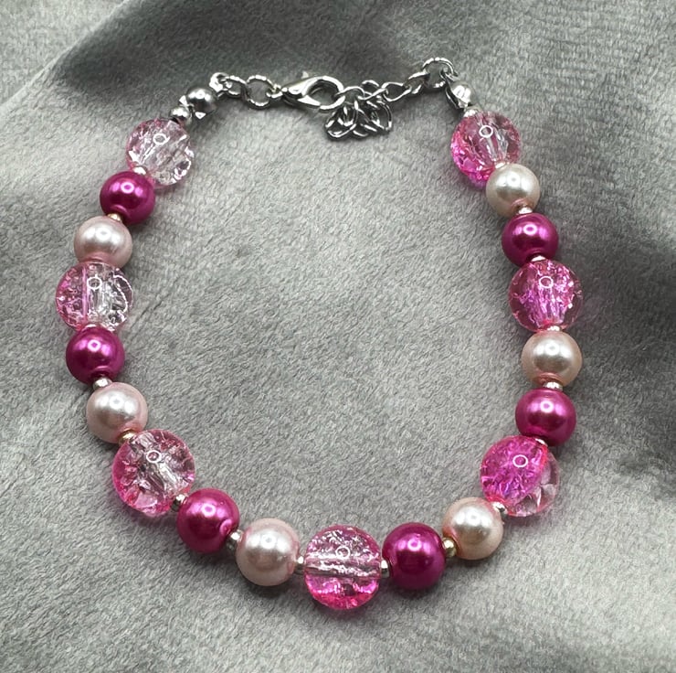 A pink beaded bracelet, with glass crackle beads and glass pearl beads.