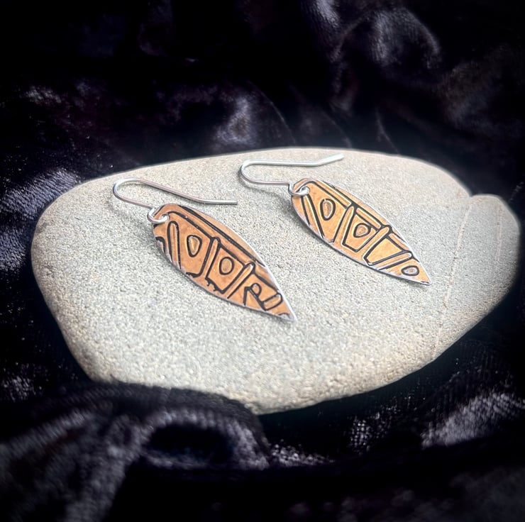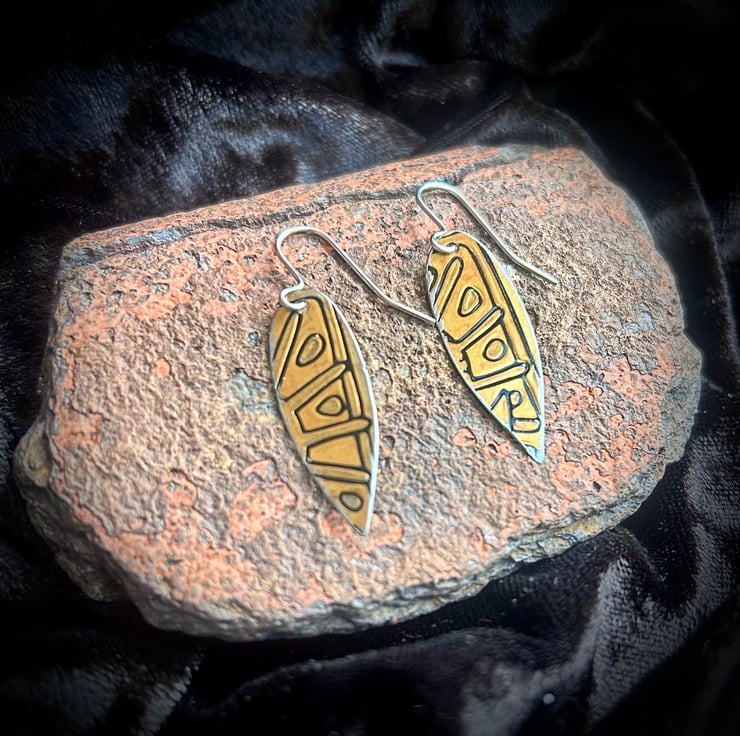 Two-tone gold, slim, leaf-shaped earrings made from a used trading card tin with steel (nickel-free) wires.