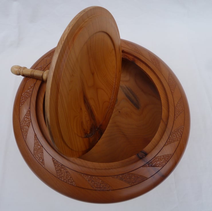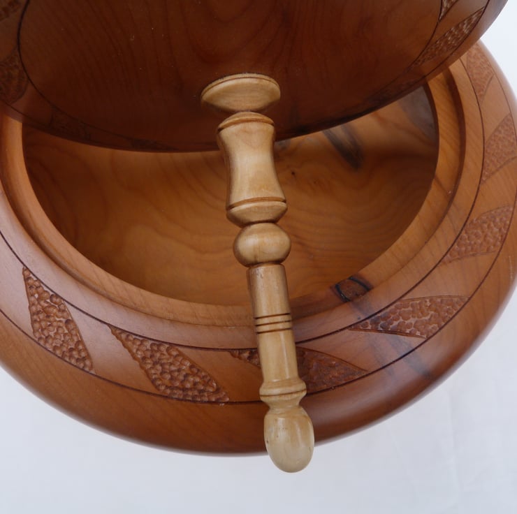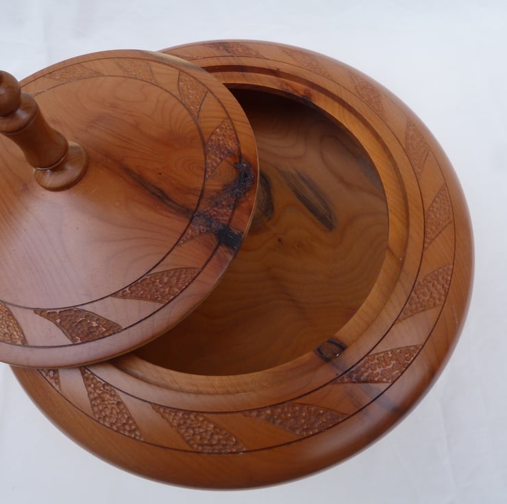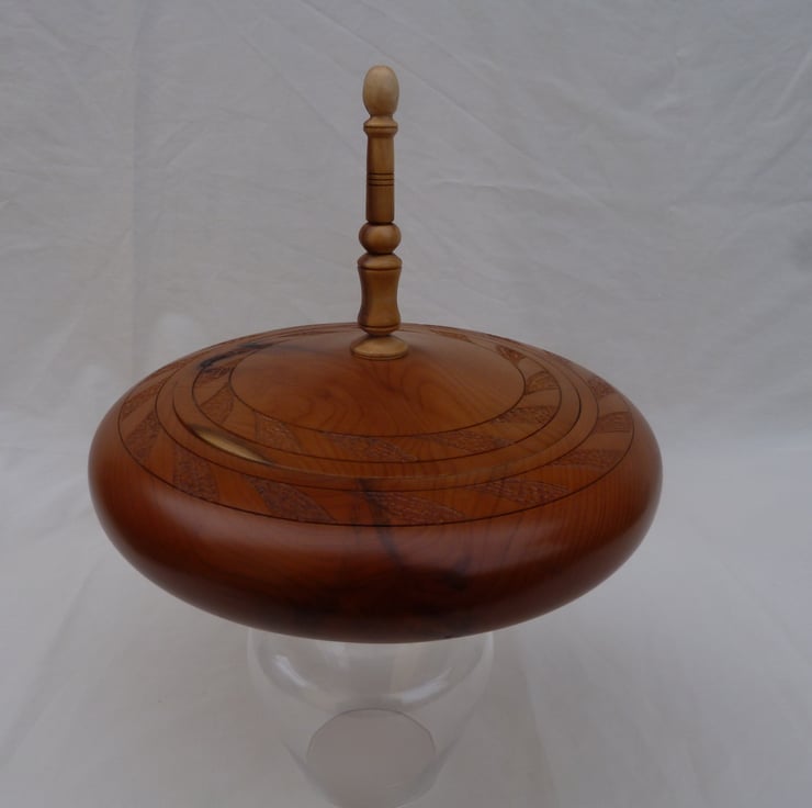 This piece from my lath is made of yew and is nine inches in diameter. The bowl part , three inches deep, quite a bit of room for storage ,the finial / handle shows the lighter sapwood in yew a great contrast. Top edges to the bowl and lidd were hand carved