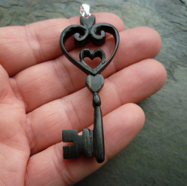 Handmade key pendant. Carved from a single piece of ebony, with a sterling silver (925) bail.