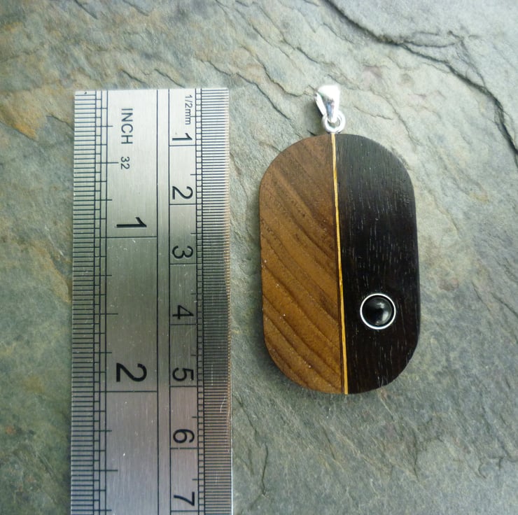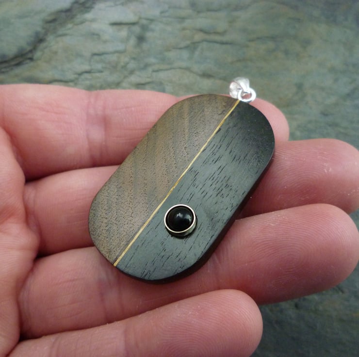Walnut , Ebony and Onyx Wood Pendant, silver