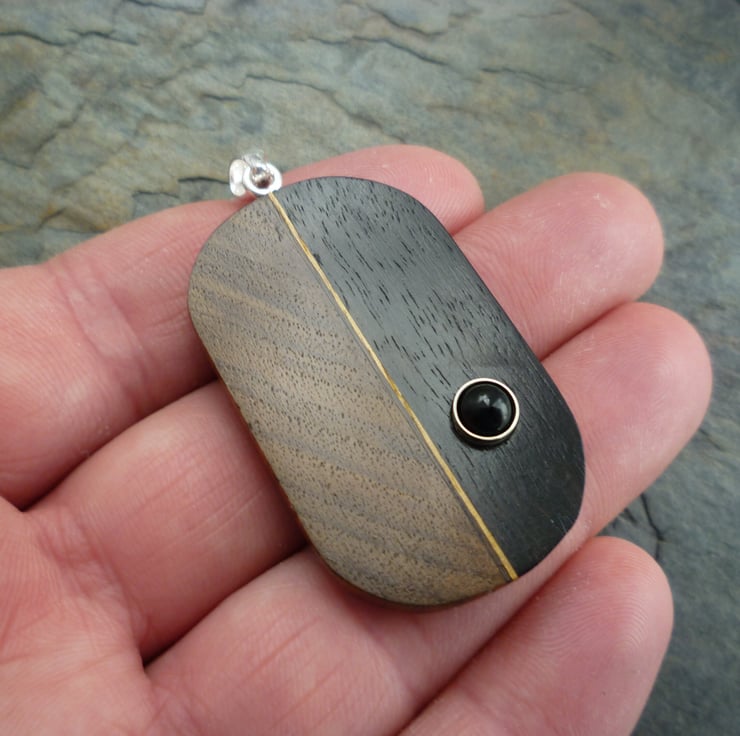 Handmade wood pendant. Carved from ebony and walnut, with maple and ebony thin wood spacers. Inset with a 5mm black onyx stone, set in a sterling silver (925) cup with a sterling silver (925) bail.