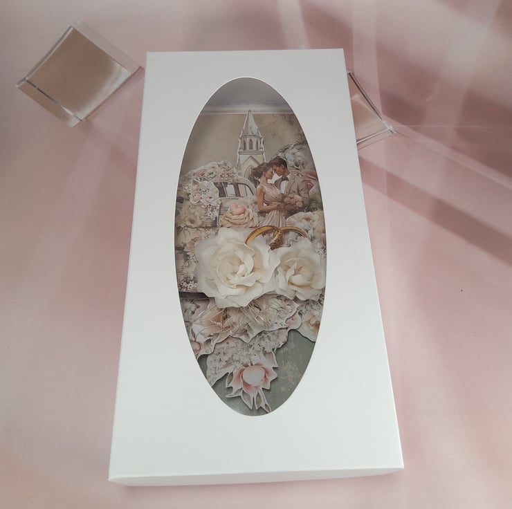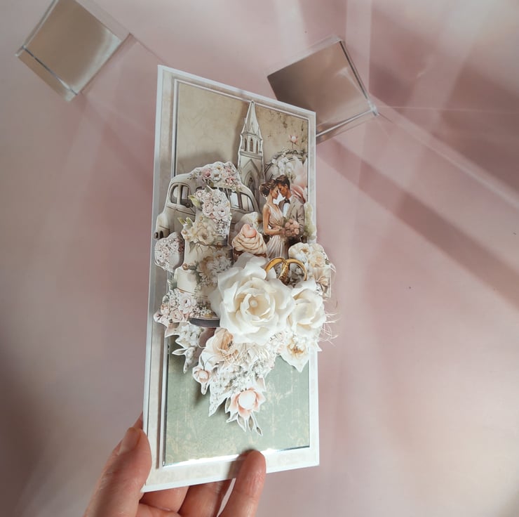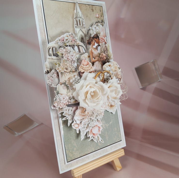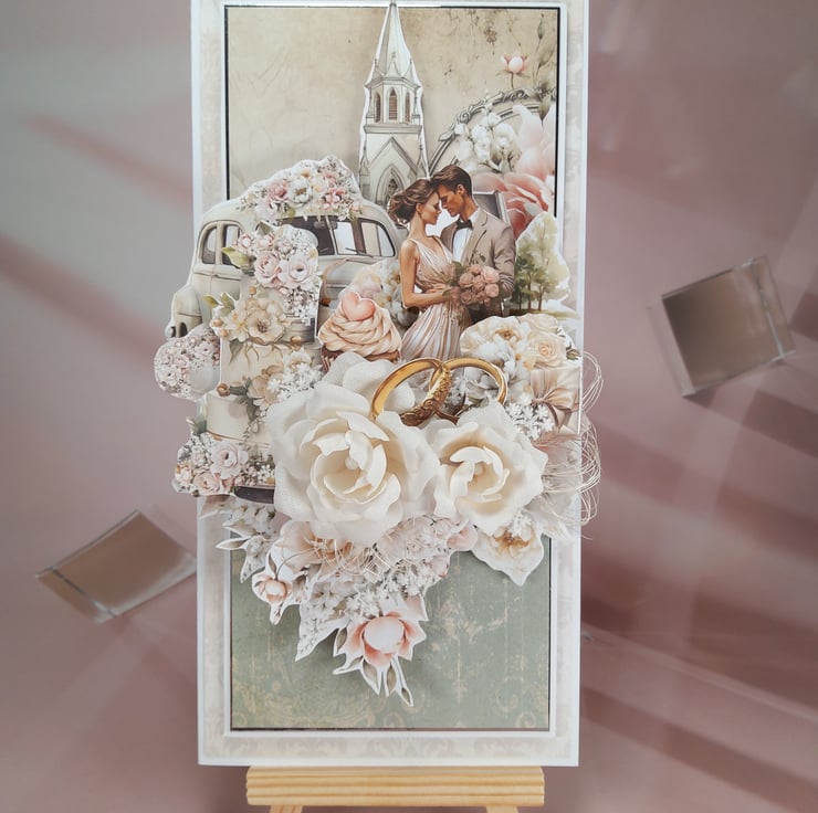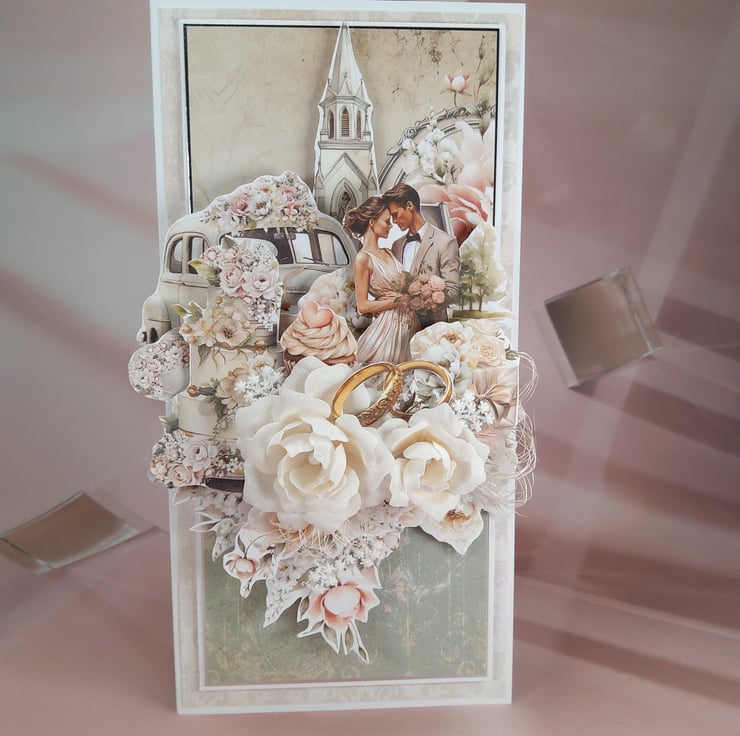 This elegant handmade wedding card is created in soft romantic tones with a rich, layered 3D composition featuring a wedding couple, classic car, church backdrop and symbolic wedding rings. Three handmade fabric roses add depth and a luxurious finish, making this card a beautiful keepsake for a special couple.