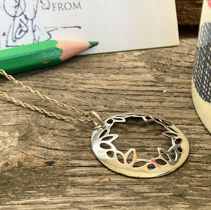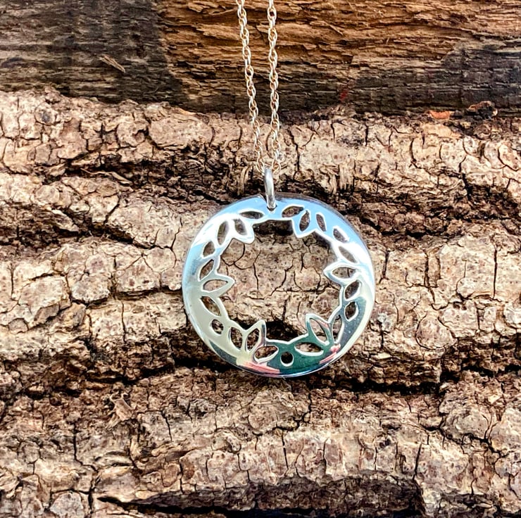 This pendant has been intricately pierced by hand from eco silver, gently domed to lay gracefully on the neck, then polished to a high shine (the reverse has a subtle satin finish). It hangs on a delicate sterling silver rope chain.
