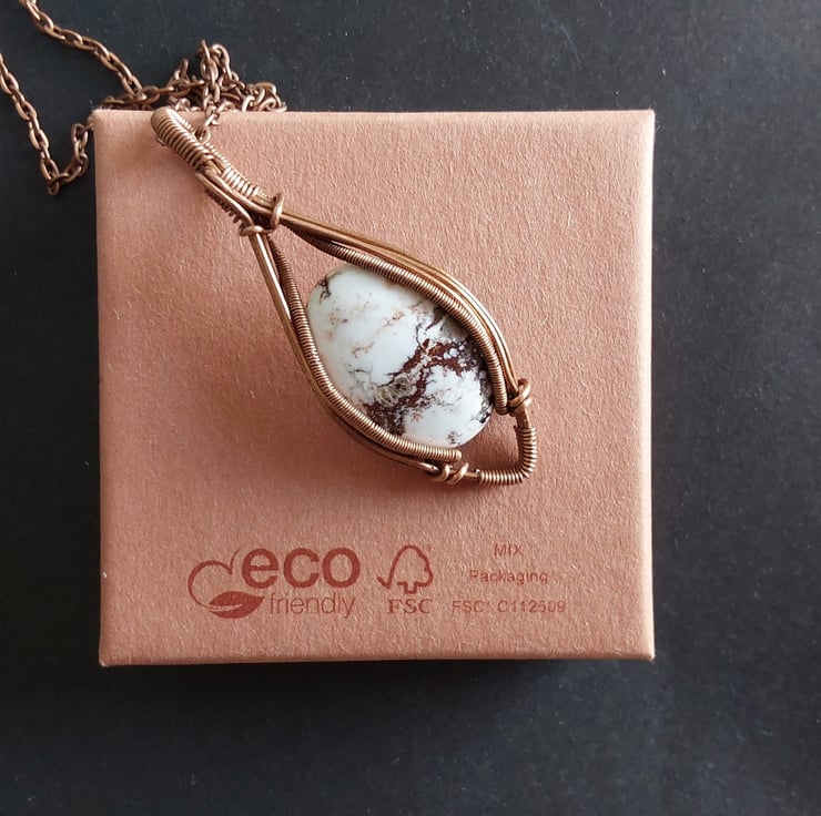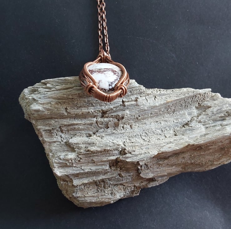 I have wire wrapped this stunning Wild Horse Jasper cabochon in a simple but elegant design. For texture, I have coiled the wires at the front of this pendant on each side.