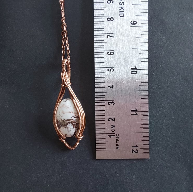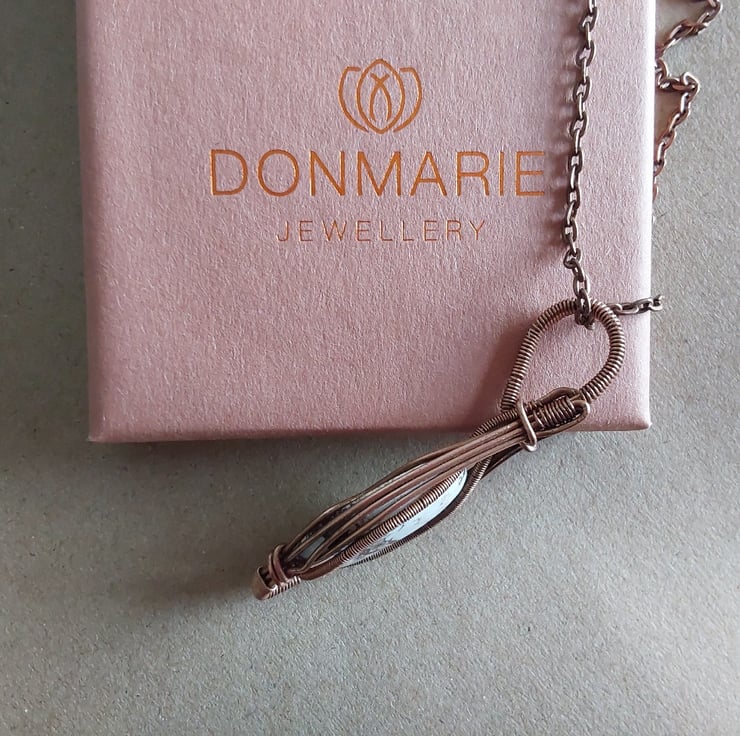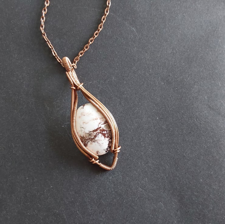 When I saw the delicate bronze coloured veining in this Wild Horse Jasper cabochon, I wanted to team it with the warm colour that copper offers. I enjoy working with copper wire due to its pliability. The fact that it can be oxidised is an added bonus for me - I love the antiqued finish achieved by this and the marvellous way it it has highlighted the bronze veining in this stone.