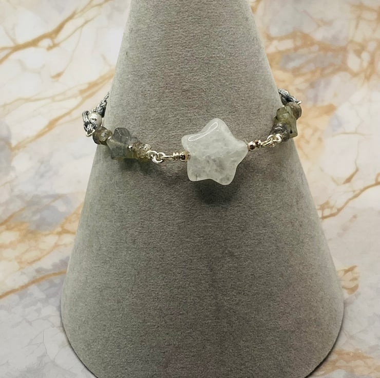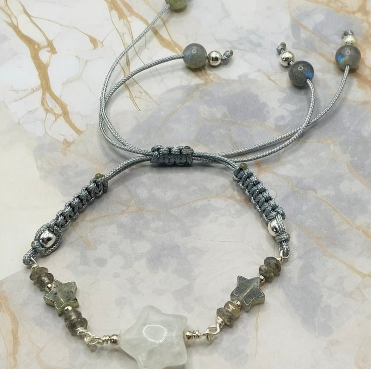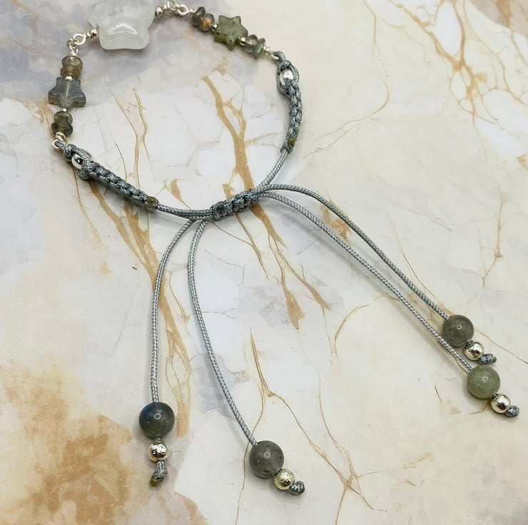A macrame slider bracelet on silver grey cord with a central 10mm clear quartz star shaped stone, surrounded on each side by rondelle shaped labradorite stones with small labradorite stars in the middle.