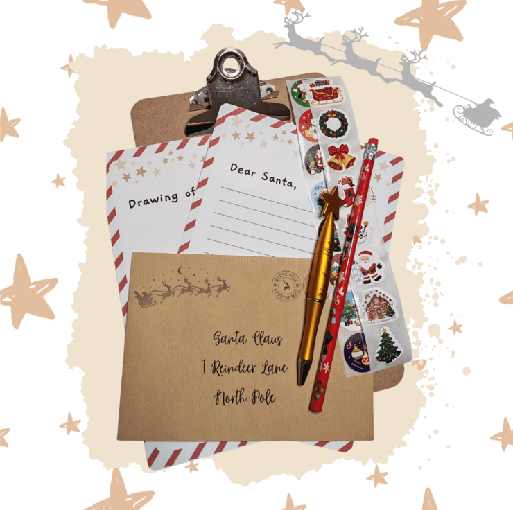 This wonderful pack has everything you need! Included is a clipboard, letter template for Santa, a sheet to create a drawing for Santa, envelope, decorative pen and pencil, and some fun stickers.
