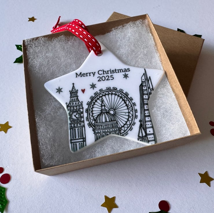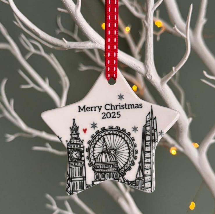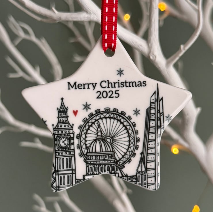 This Ceramic Christmas decoration has been individually printed using my original London illustration. It depicts special buildings in London like the London Eye, St Paul’s Cathedral, The Gherkin, Big Ben and The Shard.