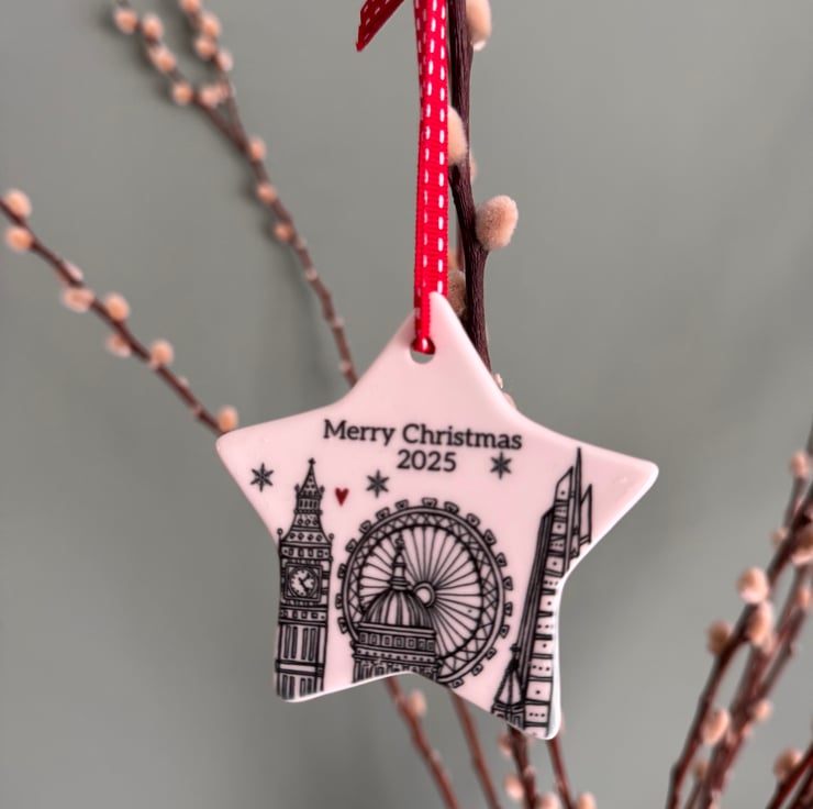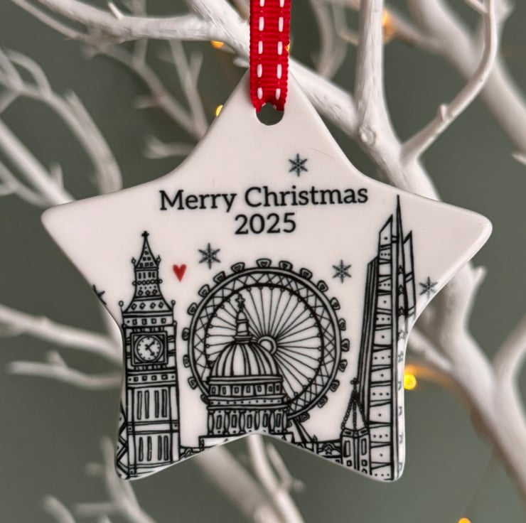 The illustration has been printed onto a great quality glazed ceramic star and above the illustration, there are the words “Merry Christmas 2025”. On the back is my logo with the words “Illustrated and made in England”.
