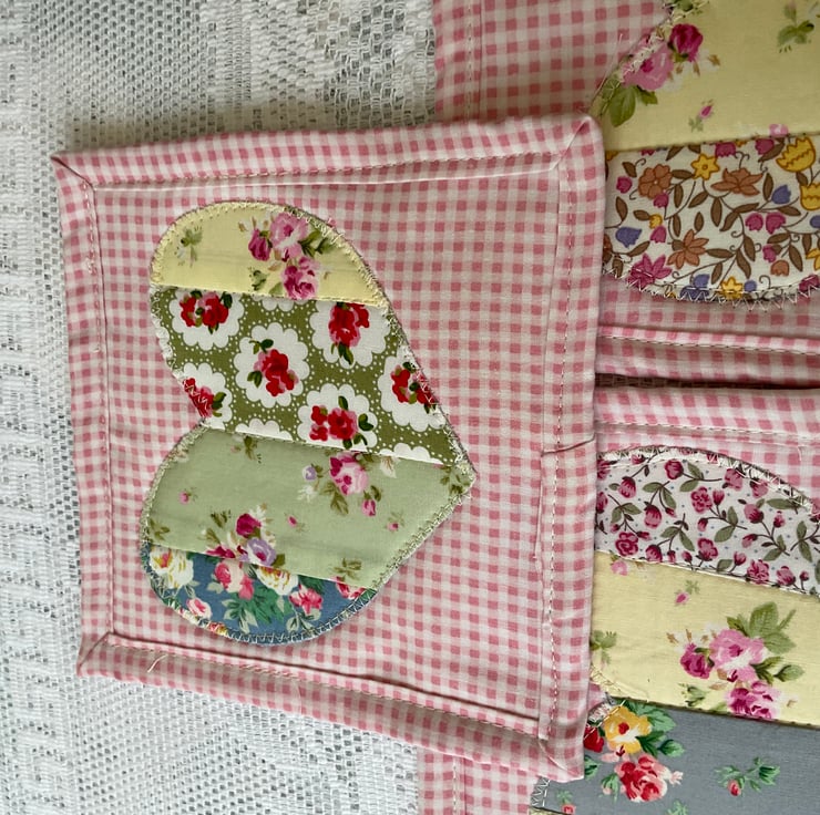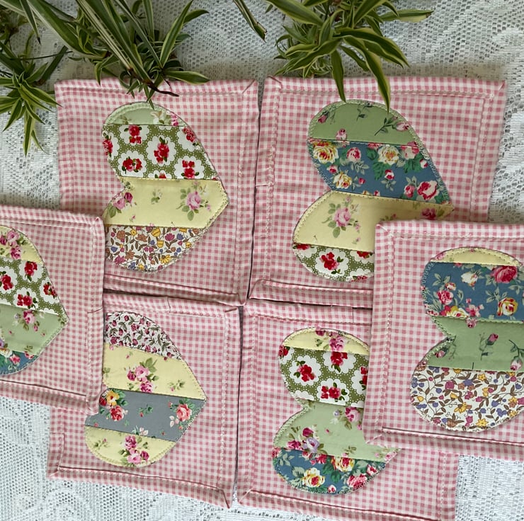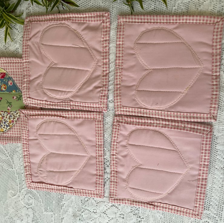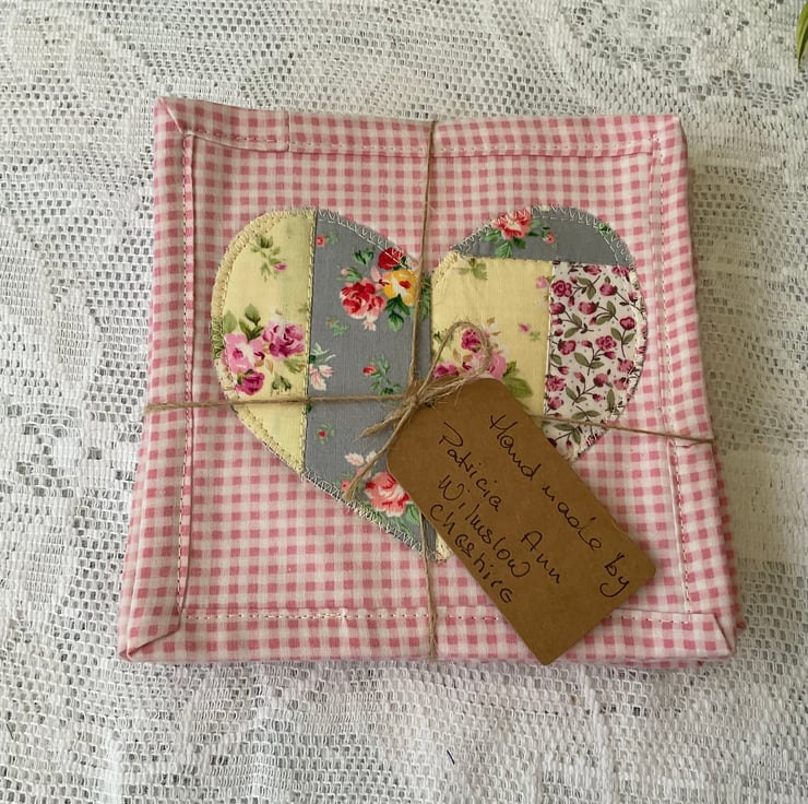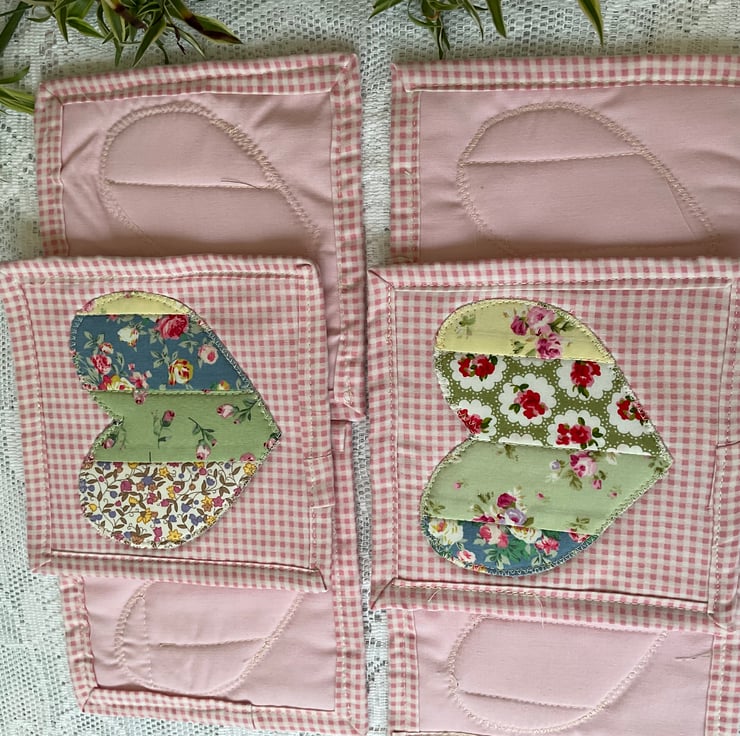 Set of 6 Handmade Rose and Hubble Appliqué Heart Large Coasters.Stocking filler, teachers gift,christmas gift.