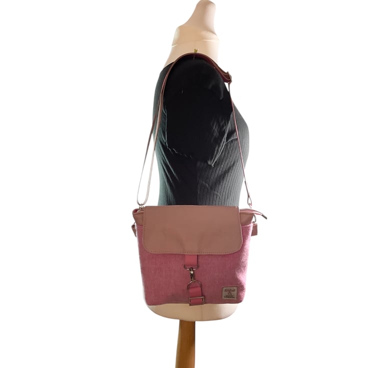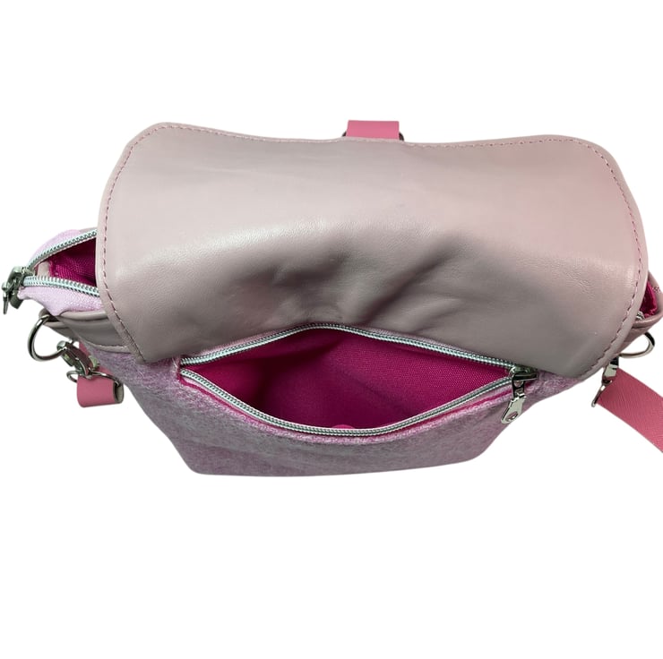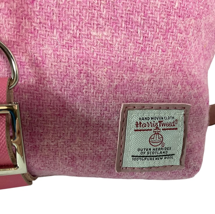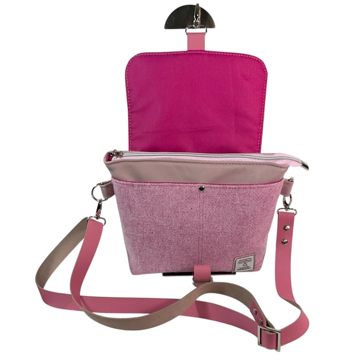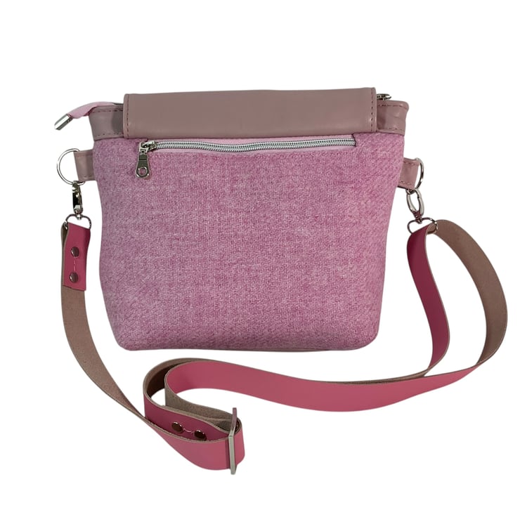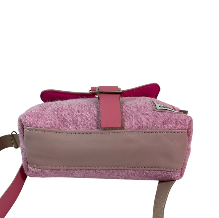This cute medium size bag is made of soft and flexible, lambs leather in an old rose pink colour and paired with stunning pure wool, unique Harris tweed fabric.