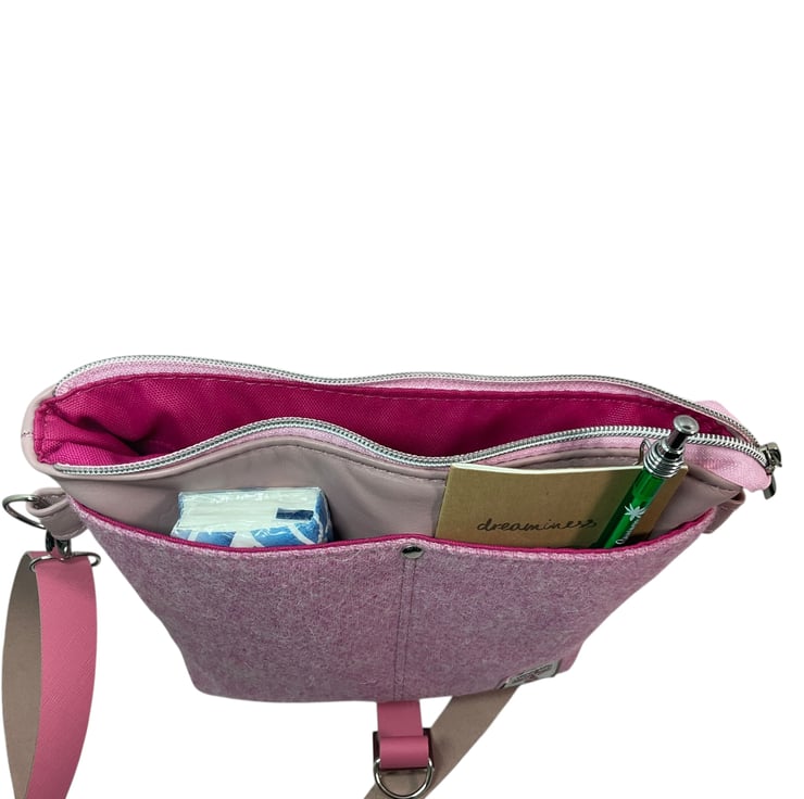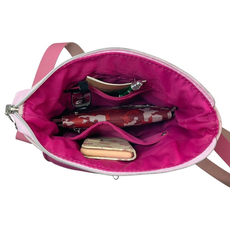 The bag is lined in cerise pink coloured water resistant canvas and has a zip pocket on one side and a slip pocket on the opposite side.