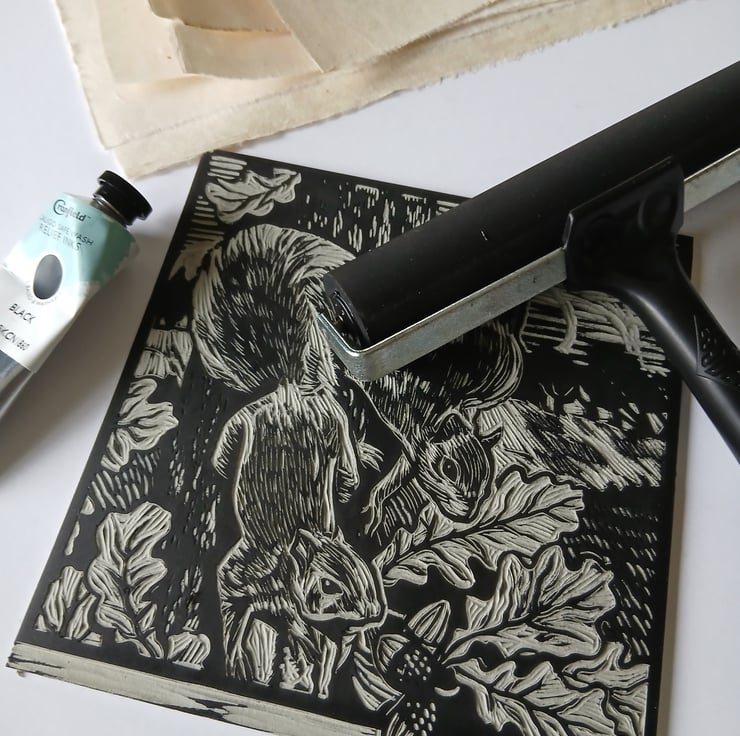 A limited edition, hand made, lino-cut print of grey squirrels.