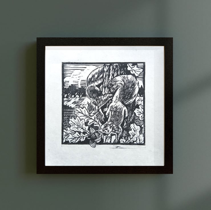 A limited edition, hand made, lino-cut print of grey squirrels.