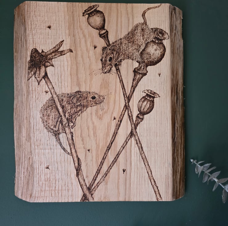 Playful mice hand drawn onto an oak live edge board using pyrography.