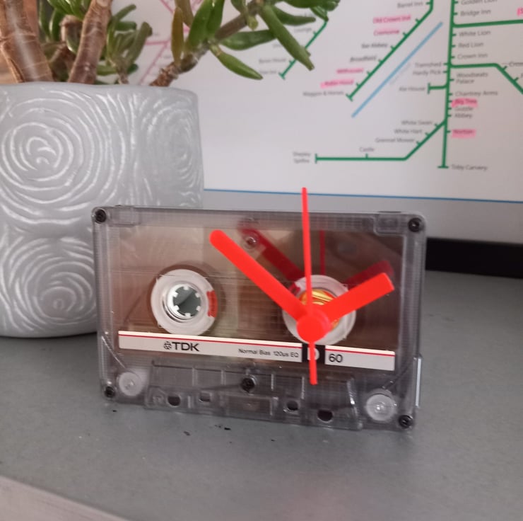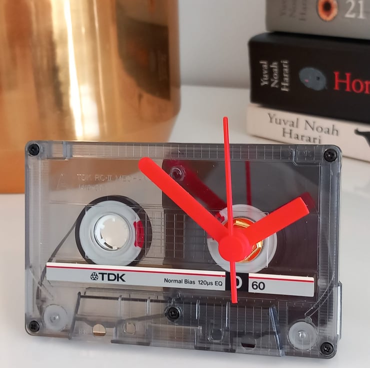 Upcycled from a genuine 80s TDK cassette tape, this retro clock gives an old classic a new twist.