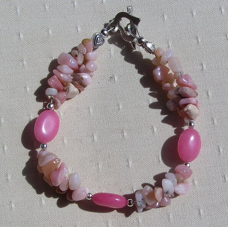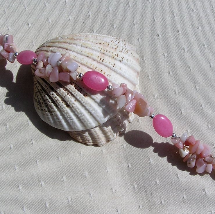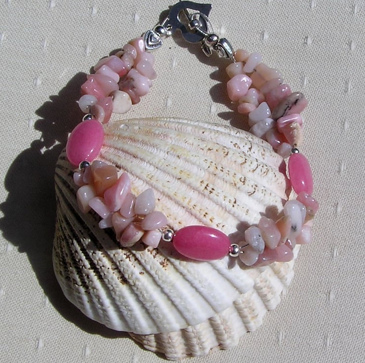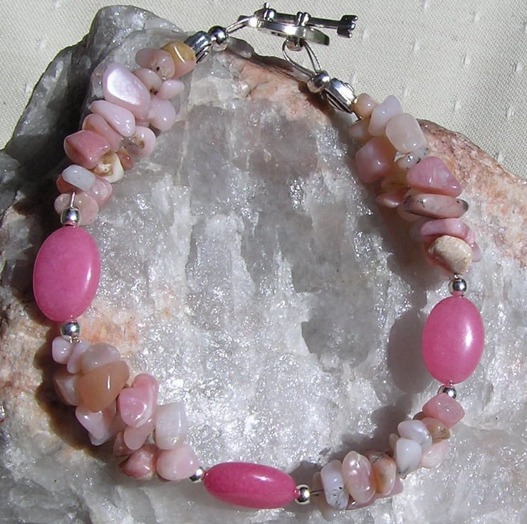 This Stunning Bracelet is made from three Pink Morganite Oval Beads separated by double-stranded Pink Opal Gem Chips along with tiny Silver spacers - a Beautiful glistening combination that will look stunning either worn casually or with something more Elegant for a Special Evening out
