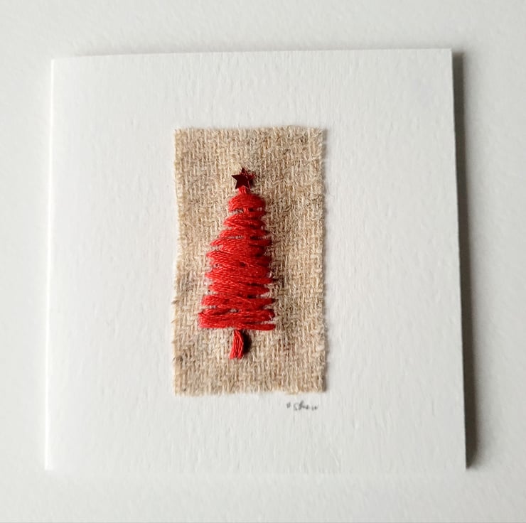 A choice of 3 9cm square greeting cards, featuring a mini green/red or purple coloured Christmas tree adorned with a sequin star on top, finished on hessian fabric and set on textured watercolour paper.