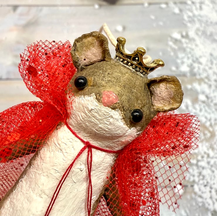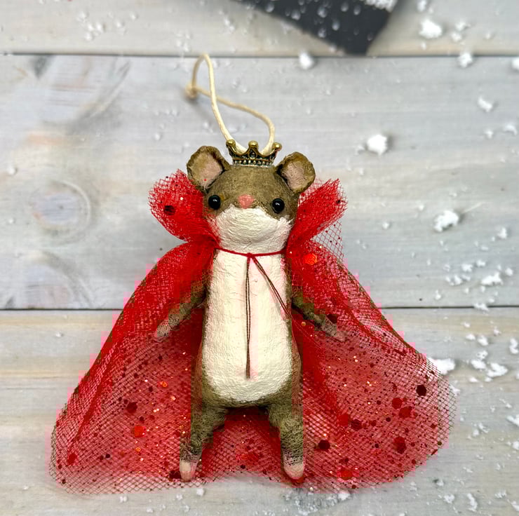 Christmas King Mouse decoration made using spun cotton and then hand painted. Mouse has glass bead eyes and metal crown. Mouse wears a sparkly tulle cape in red and comes with waxed thread hanger attached. Measures roughly 8.5cm tall.