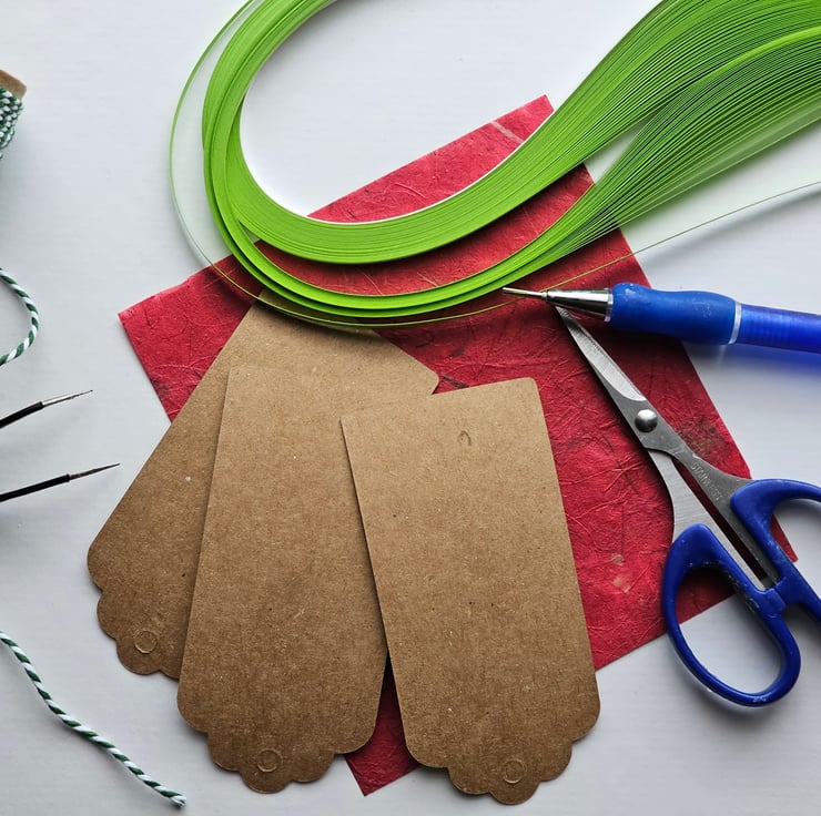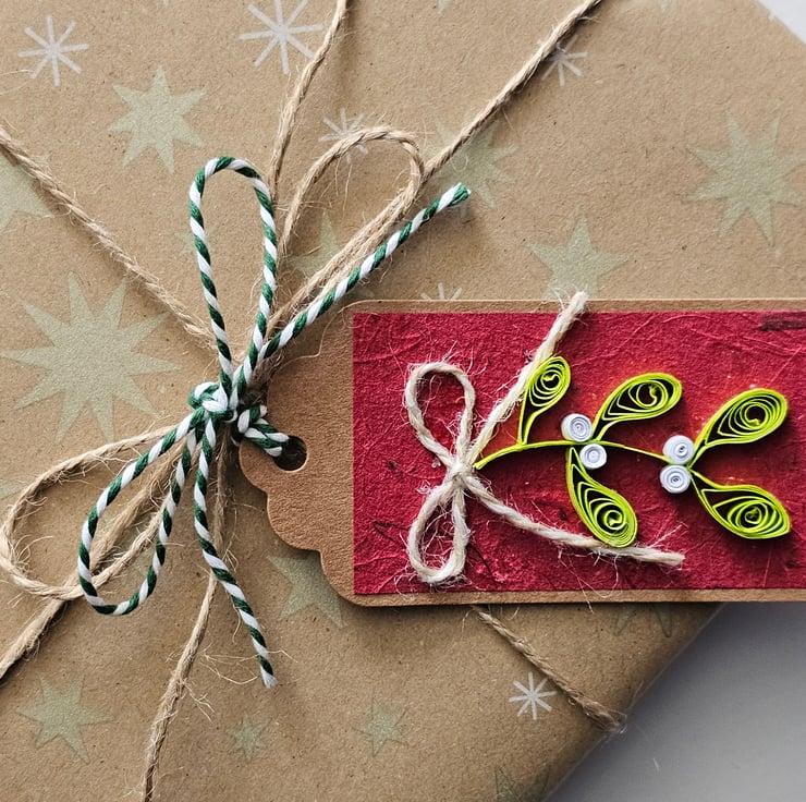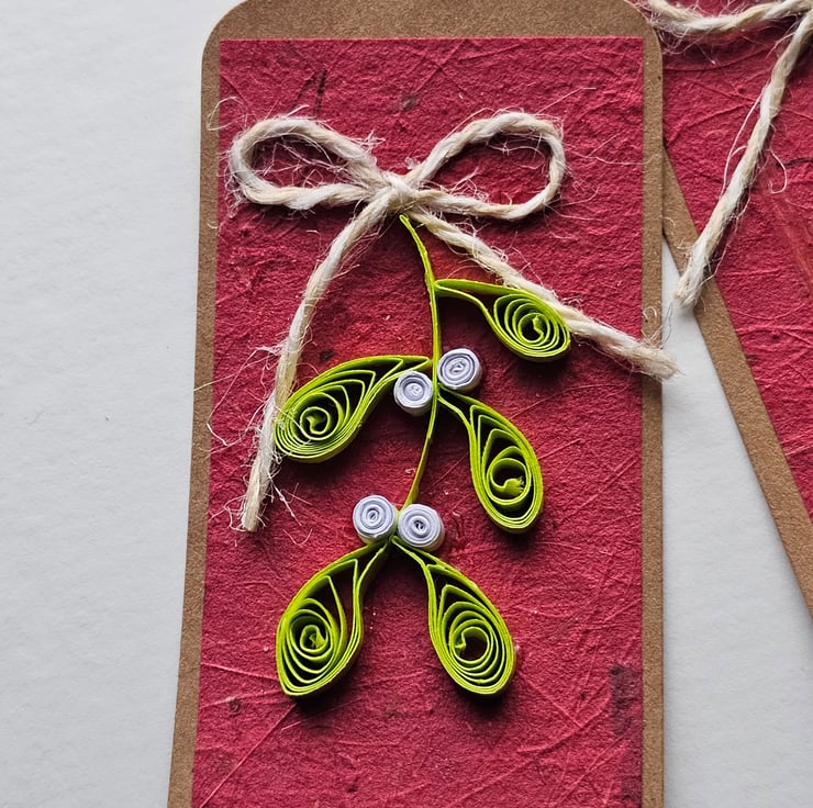 The tags are made with care using brown kraft labels, red banana paper, green and white quilling paper strips, jute twine and green & white bakers twine. There are small variations between them (shapes, positioning, etc.) as they are handmade and unique.