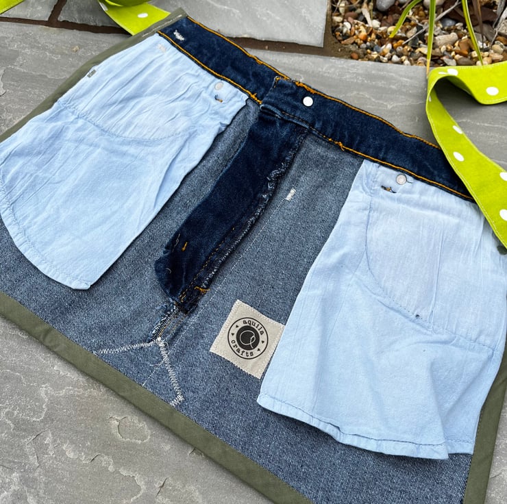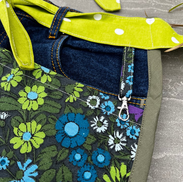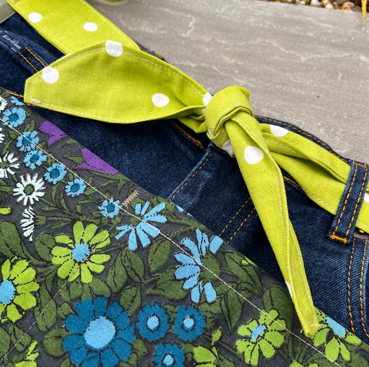 The edges are finished with binding. Waist ties are made from green spotty cotton. They measure 235cm from end to end. There is a small clip ideal for keys.