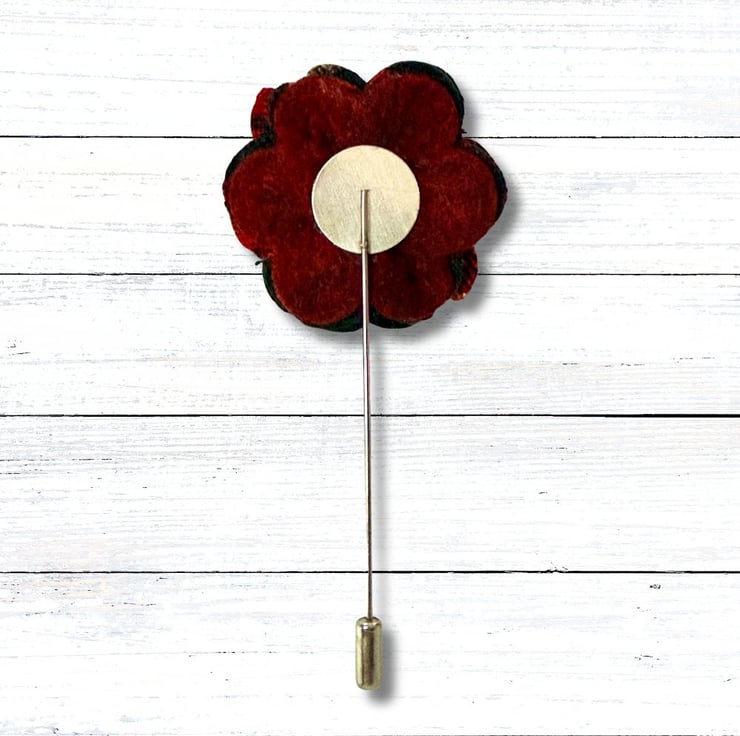 Elevate any outfit with this exquisite handmade fabric flower lapel pin. Carefully hand-sewn using recycled fabric featuring a tartan print.