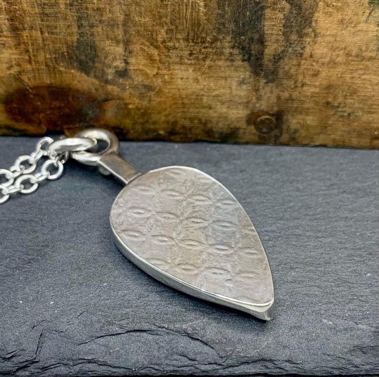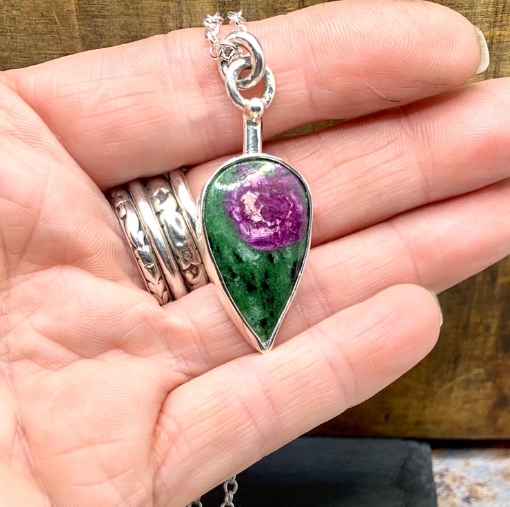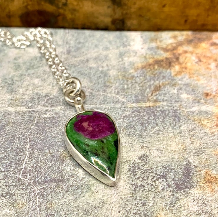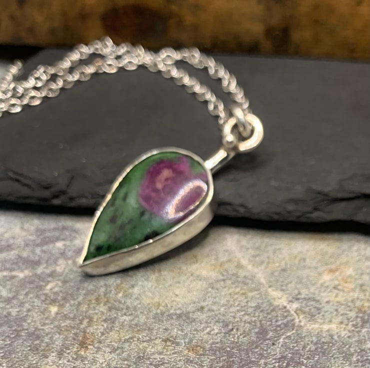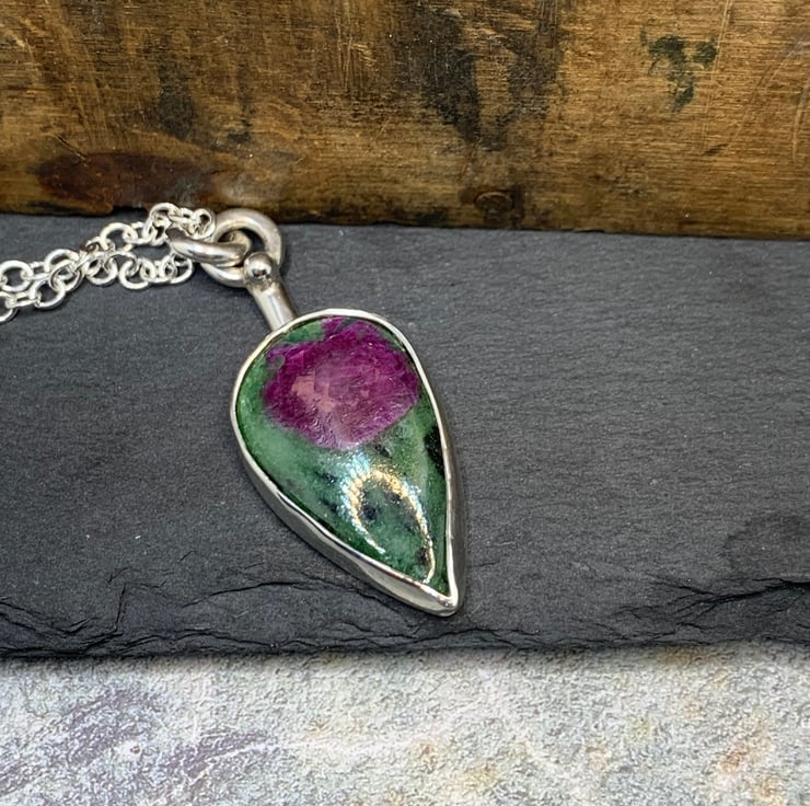 This lovely Ruby Zoisite stone has been set in sterling silver. The sone setting measures 30mm long and 18mm at its widest point, the pendant as a whole measures 43mm and hangs on a 20 inch chain