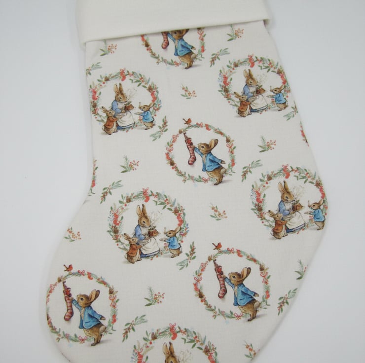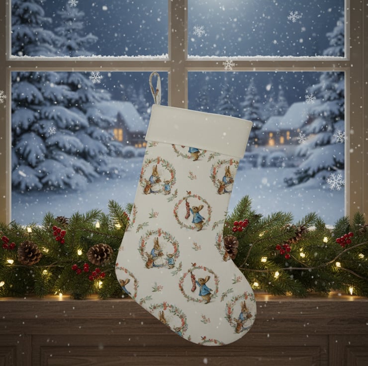 A white Christmas stocking with a playful, repeating pattern, Peter Rabbit. The Stocking is 8" x 17", lined with felt, and features a fluffy trim and a hanging loop.