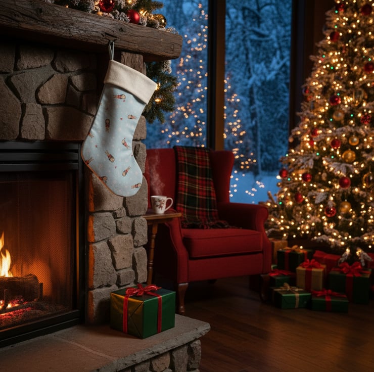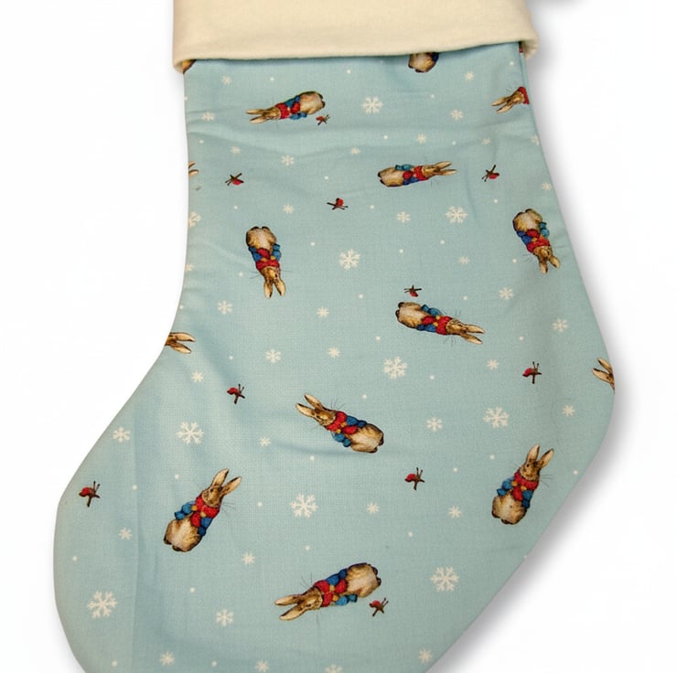 A light blue/off-white Christmas stocking with a playful, repeating pattern (Peter Rabbit), The Stocking is 8"x 17", lined with felt and has a fluffy trim and a hanging loop.