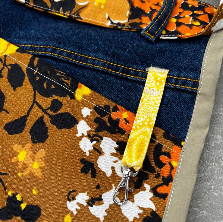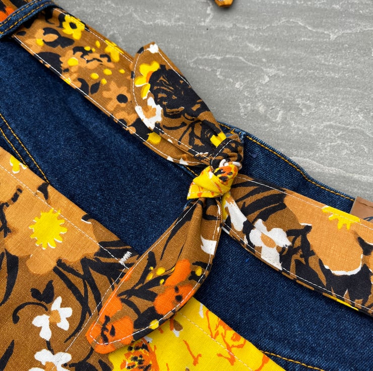 The edges are finished with binding. Waist ties are made from matching cotton. They measure 200cm from end to end. There is a small clip ideal for keys.