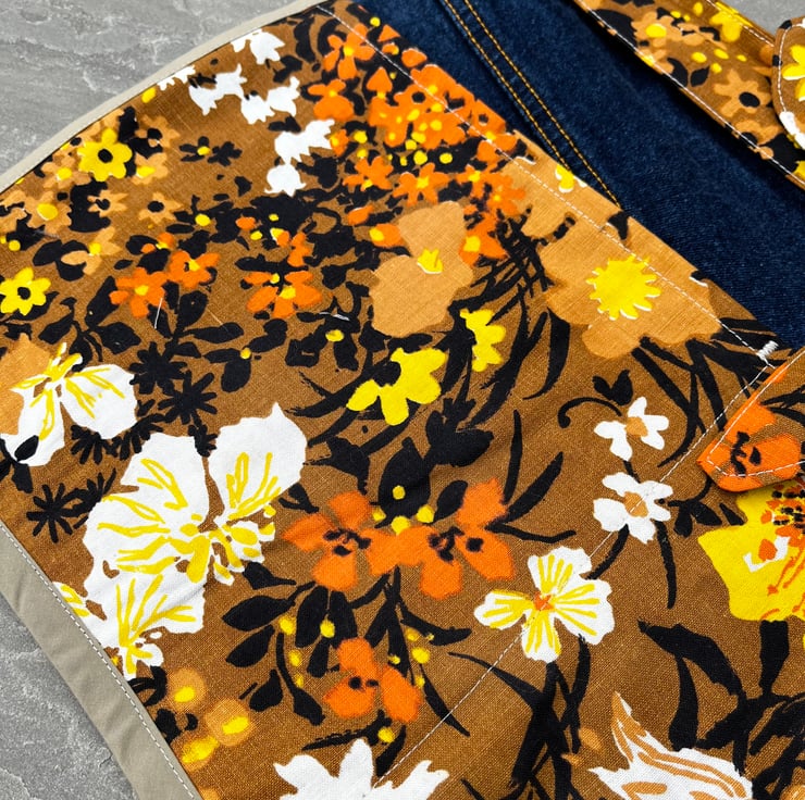 Cute one of a kind apron made from the back of a pair of jeans and pretty vintage floral cotton. There are two pockets from the jeans and two large pockets from the floral fabric.