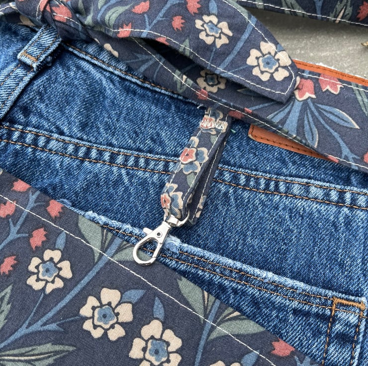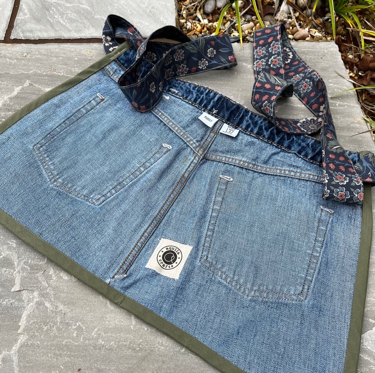 Cute one of a kind apron made from the back of a pair of jeans and pretty reclaimed floral Liberty Lindsay cotton from a curtain. There are two pockets from the jeans and two large pockets from the floral fabric.