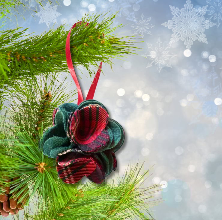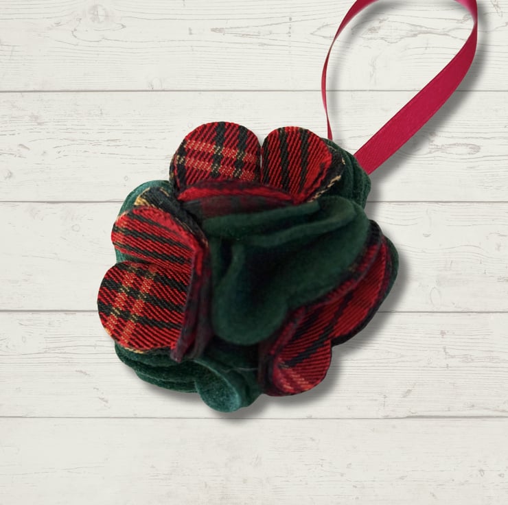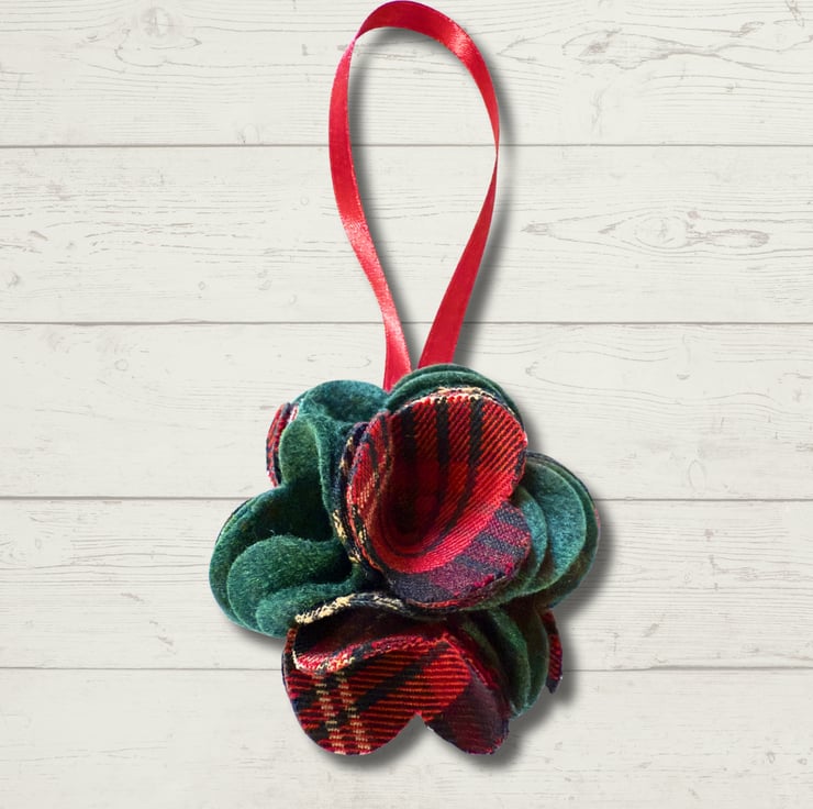 Add a touch of handmade charm to your Christmas tree with this beautiful fabric flower bauble. Made from deep green felt and traditional tartan fabric in festive reds and greens.