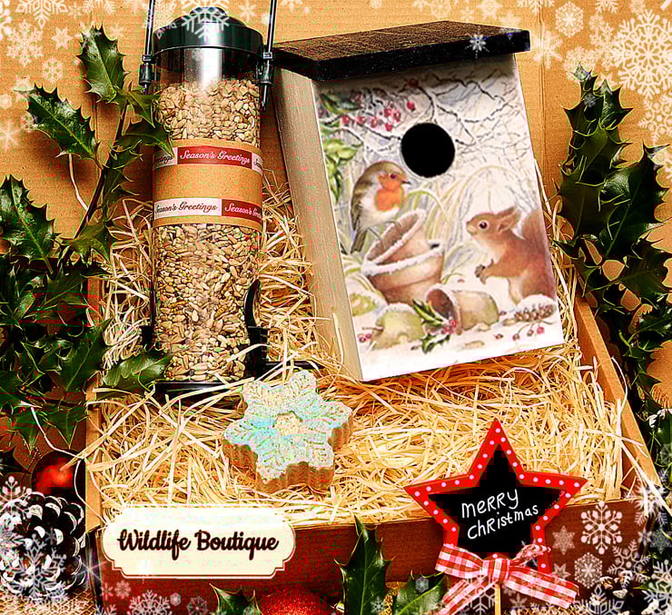 Handmade Festive Robin & Squirrel Nest Box Gift Set with seed and feeder